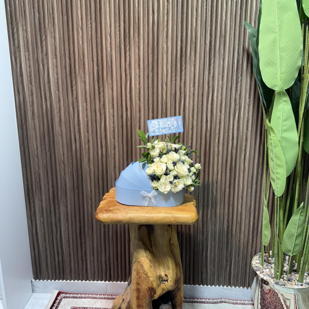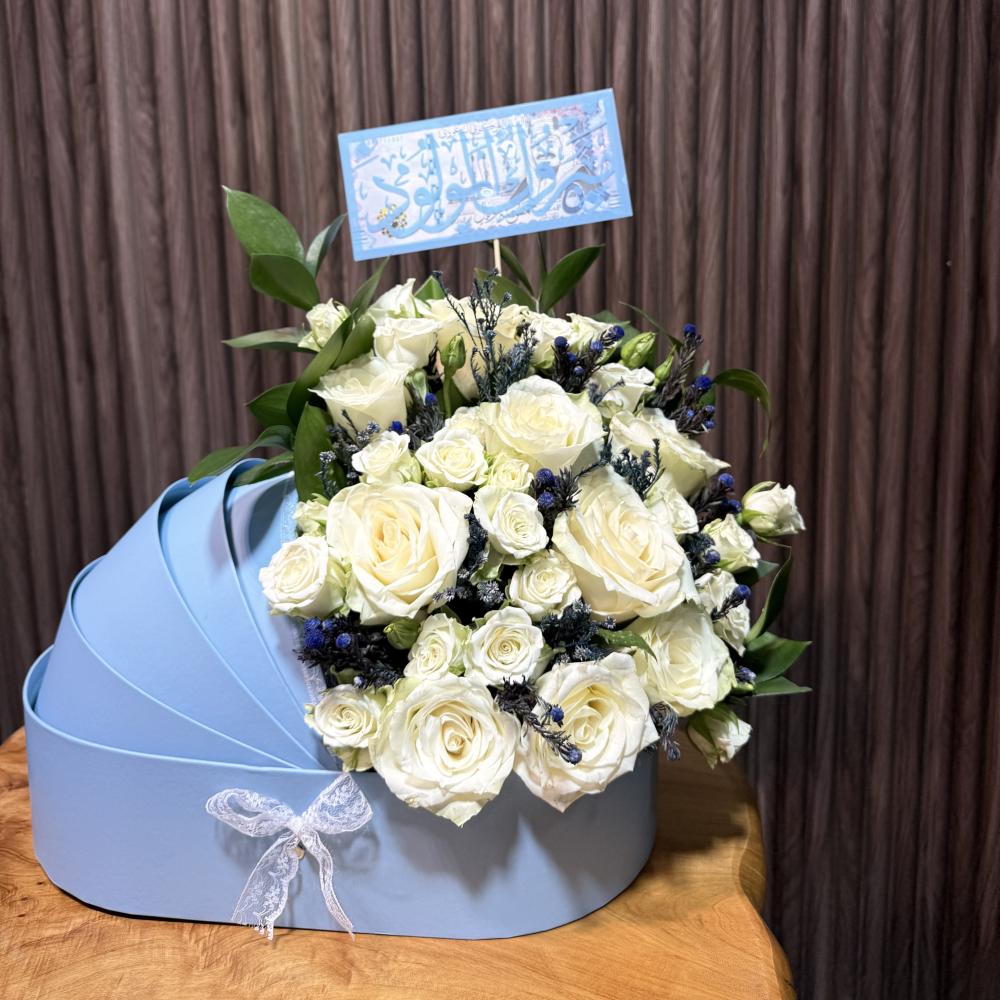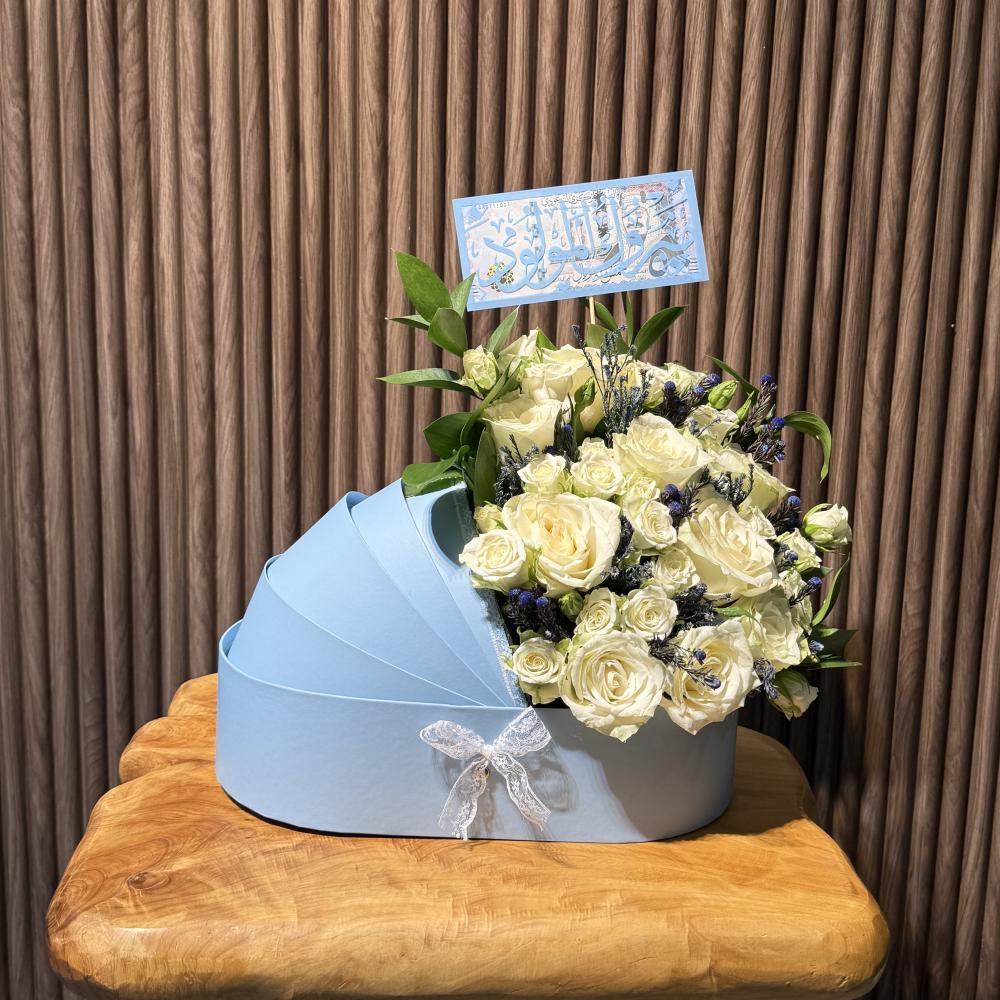 استاند مولود باللون الابيض مع ورد متنوع مع امكانيه اضافه عباره
