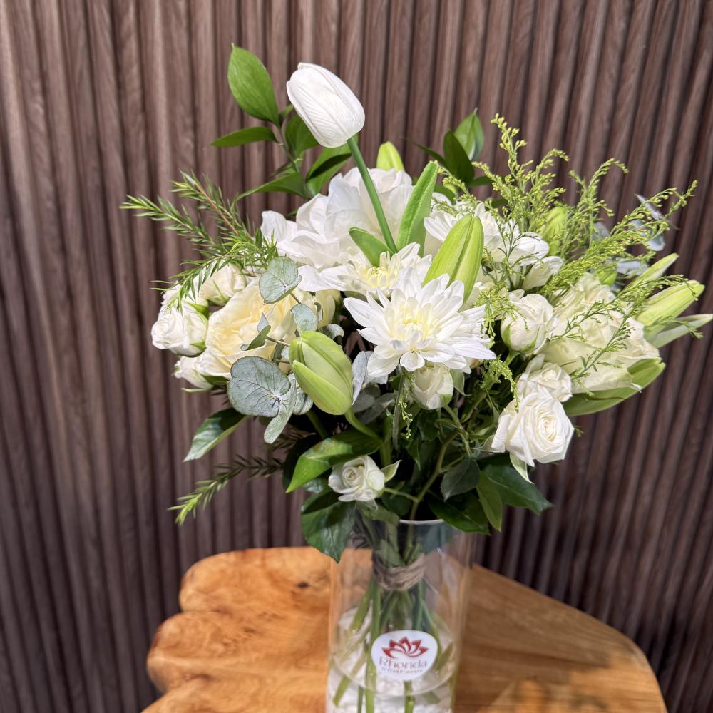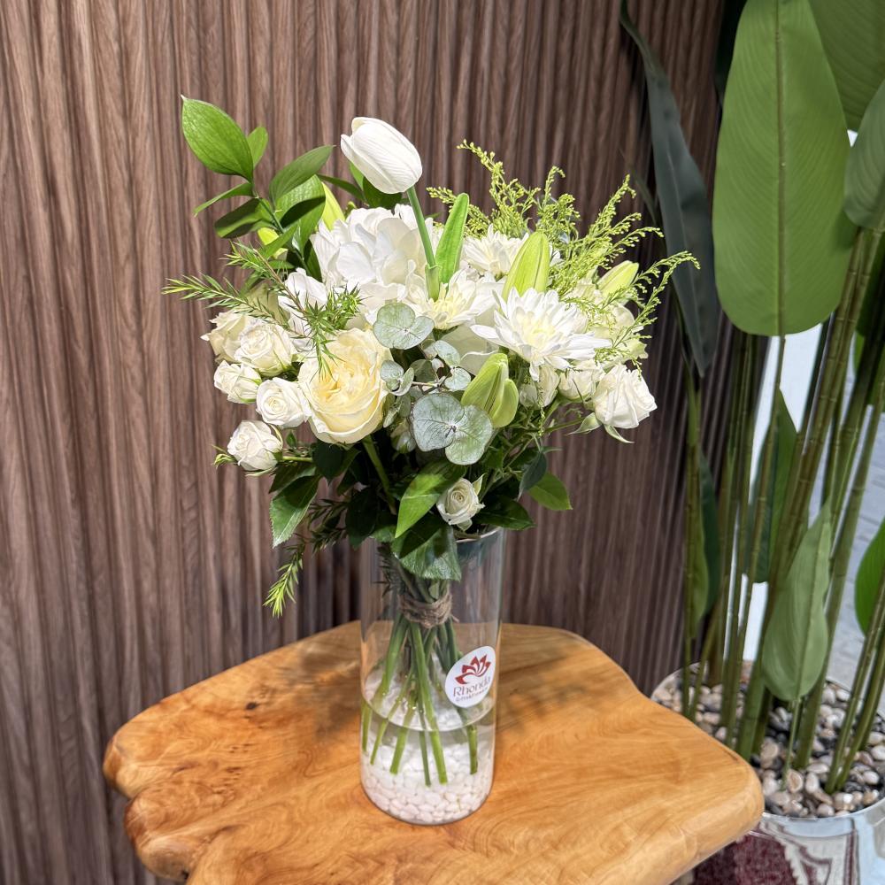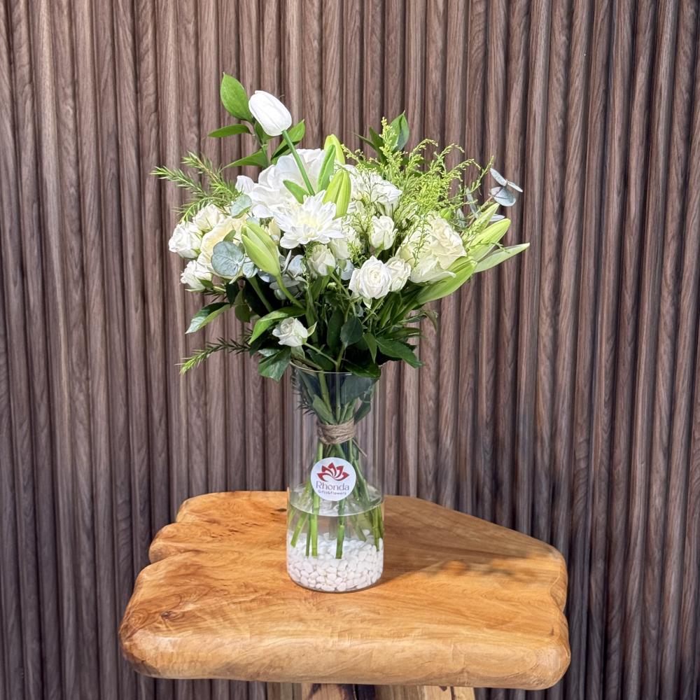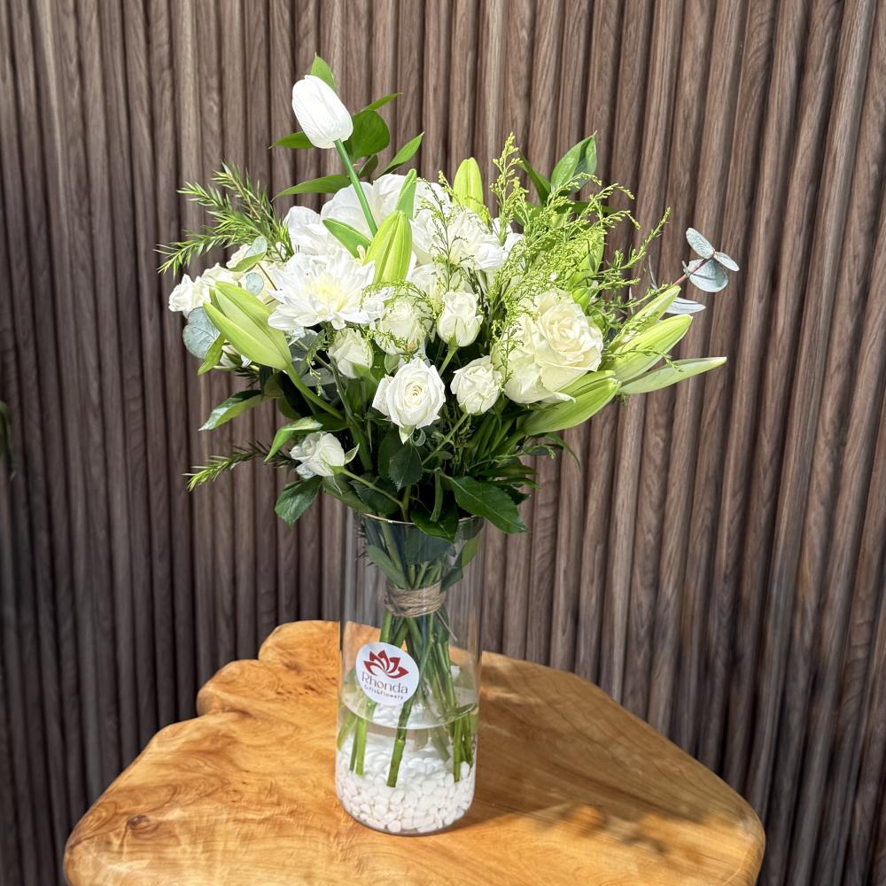 فازة ورد شفافة مع ورد الطبيعي باللون الابيض واضافة ورد الليليوم الطبيعي مع اضافة الورد الصناعي و لمسات من الاكسسوار الطبيعي