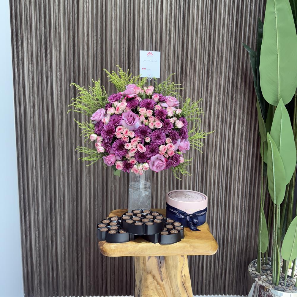 الشكل النهائي : يأتي مع فازه ورد زجاجيه بتنسيق انيق متعدد مع اضافات جماليه من الاكسسوار الطبيعي