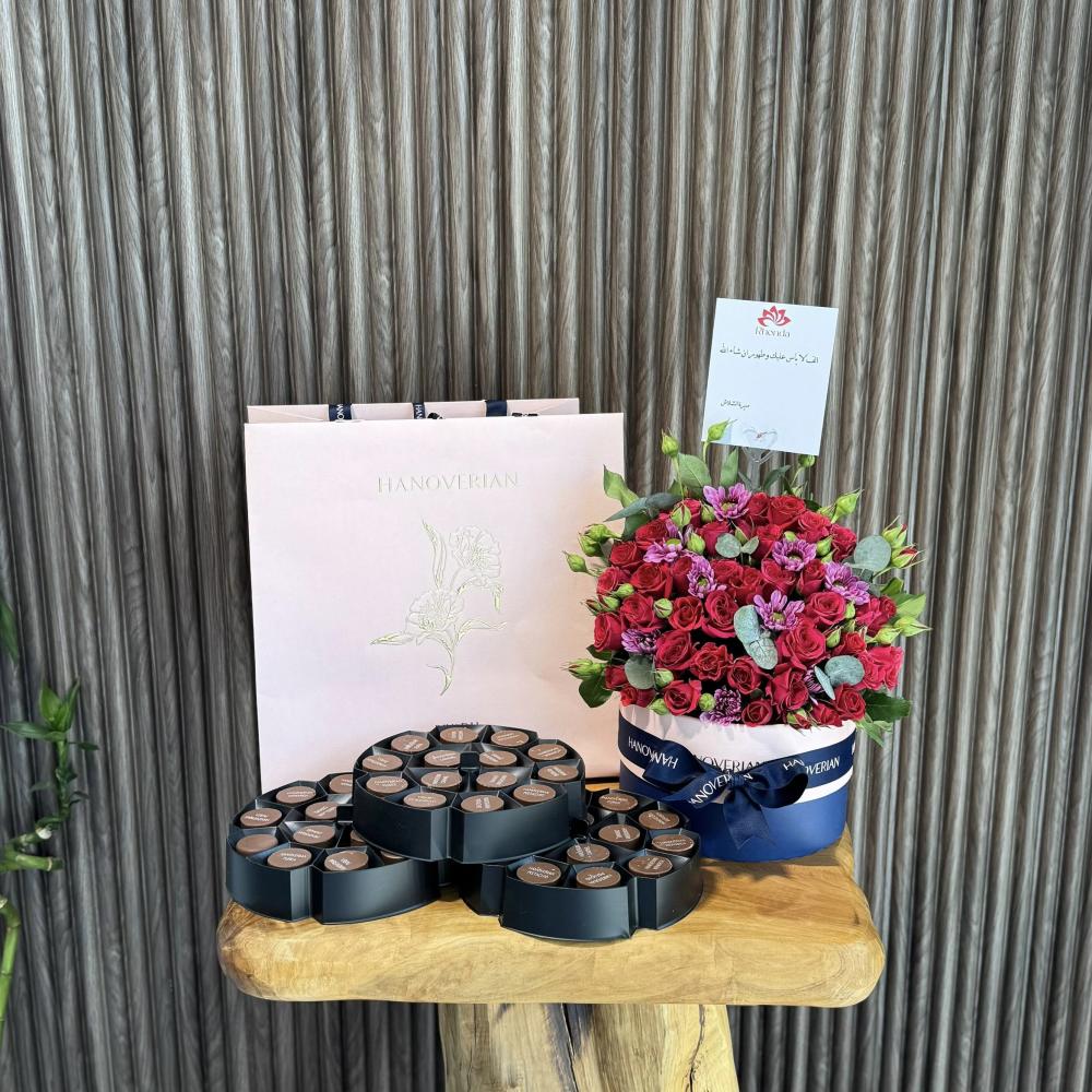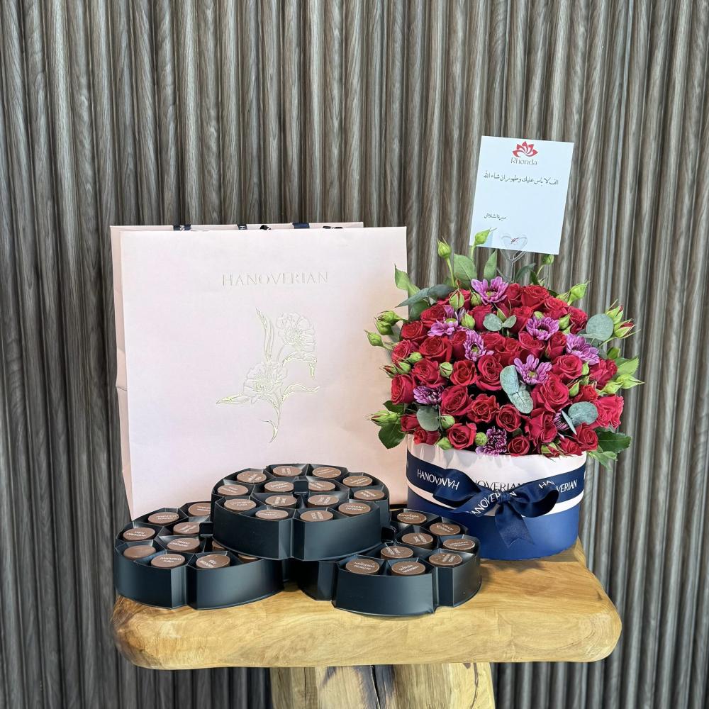 الشكل النهائي : يوضع الورد بمختلف اللوان في اعلى صندوق الشوكولاتة وياتي بتنسيق انيق متعدد مع اضافات جماليه من الاكسسوار الطبيعي
