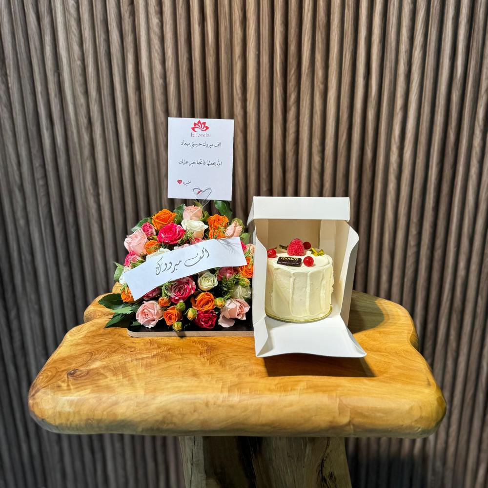 الشكل النهائي : تاتي بتنسيق من الورد الطبيعي بمختلف اللوانه مع قاعده خشبيه توضع فيها الكيكة مع تنسيق الورد ويمكن اضافه عباره على الورد من الورق المطبوع ويمكن اضافه بالون او قبعة تخرج مدفوعة وتاتي بخيارات اكثر وتقدم مع باقة ورد او فازة ورد حسب اختيار العميل