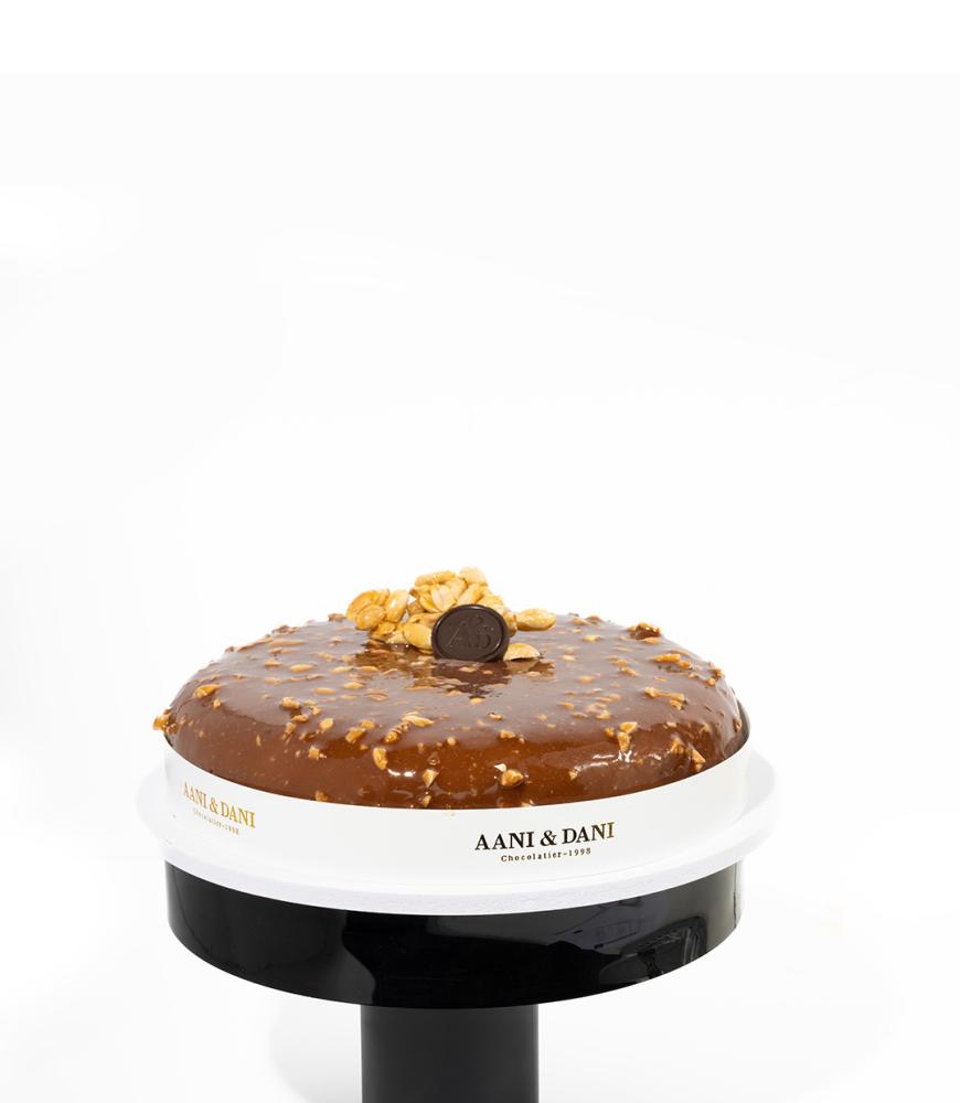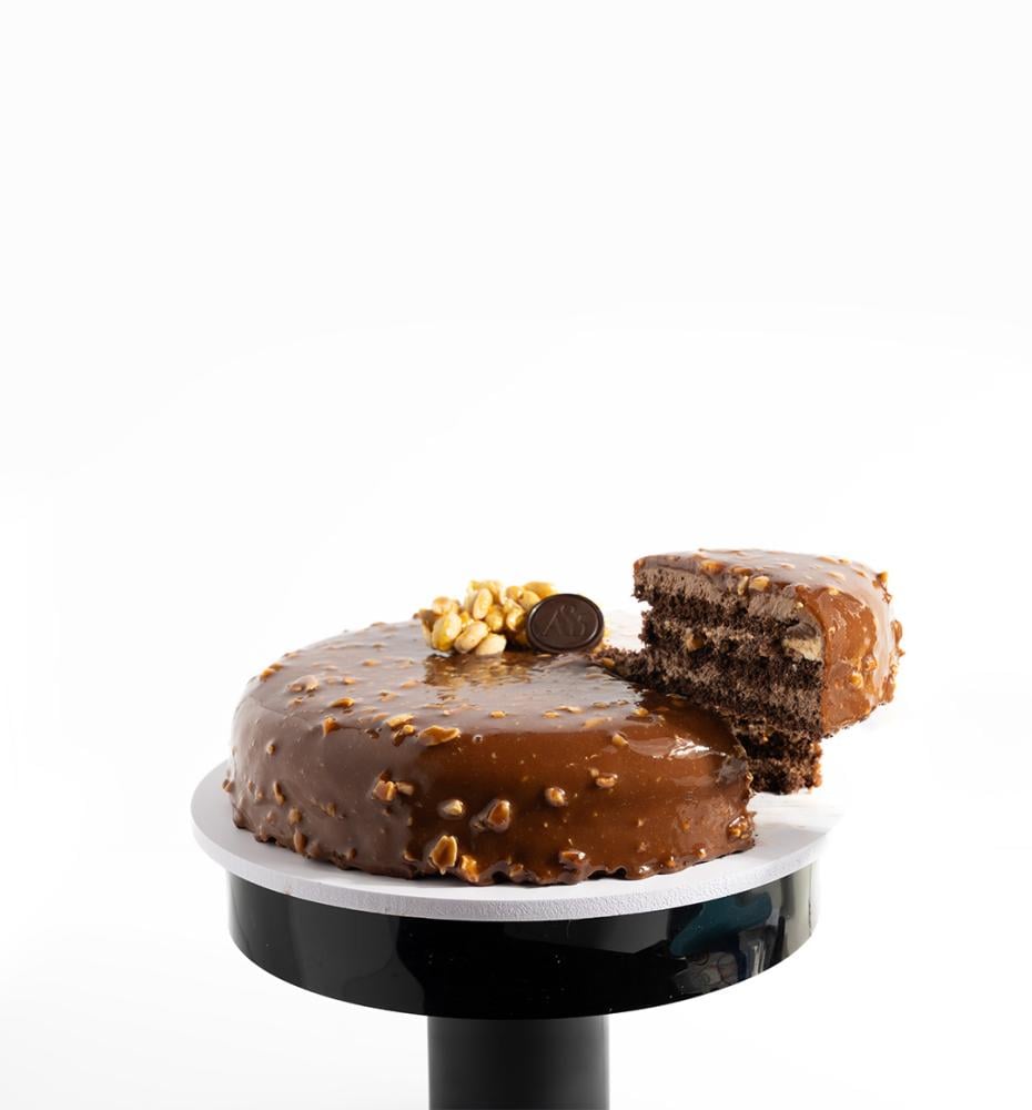 كيكة محشوة بمزيج غني من الشوكلاتة والفول السوداني مع حبات الفول السوداني المقرمشة. مزينة بطبقة رقيقة من الشوكلاتة وقطع الفول السوداني المحمص
