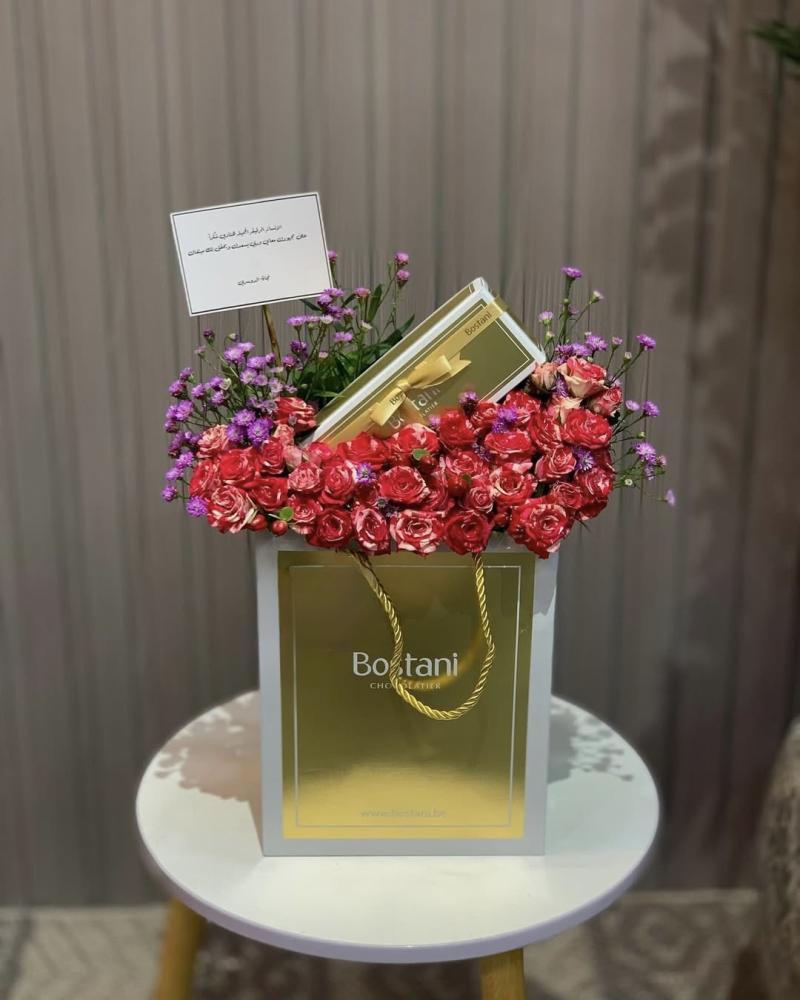 الشكل النهائي : يوضع الورد بمختلف اللوان في اعلى الكيس الخاص وياتي بتنسيق انيق متعدد مع اضافات جماليه من الاكسسوار الطبيعي