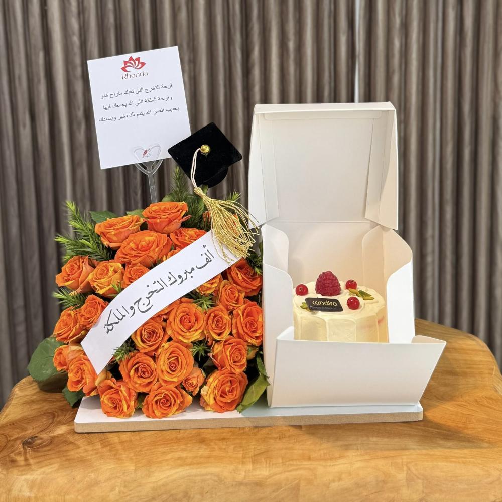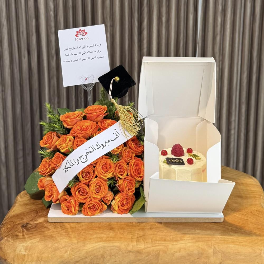 الشكل النهائي : تاتي بتنسيق من الورد الطبيعي بمختلف اللوانه مع قاعده خشبيه توضع فيها الكيكة مع تنسيق الورد ويمكن اضافه عباره على الورد من الورق المطبوع ويمكن اضافه بالون او قبعة تخرج مدفوعة وتاتي بخيارات اكثر وتقدم مع باقة ورد او فازة ورد حسب اختيار العميل