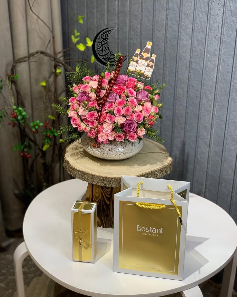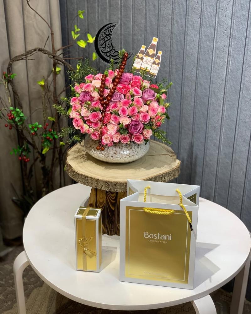 الشكل النهائي : ياتي الشوكلت مع فازة ورد طبيعي وياتي بتنسيق انيق متعدد مع اضافات جماليه من الاكسسوار الطبيعي