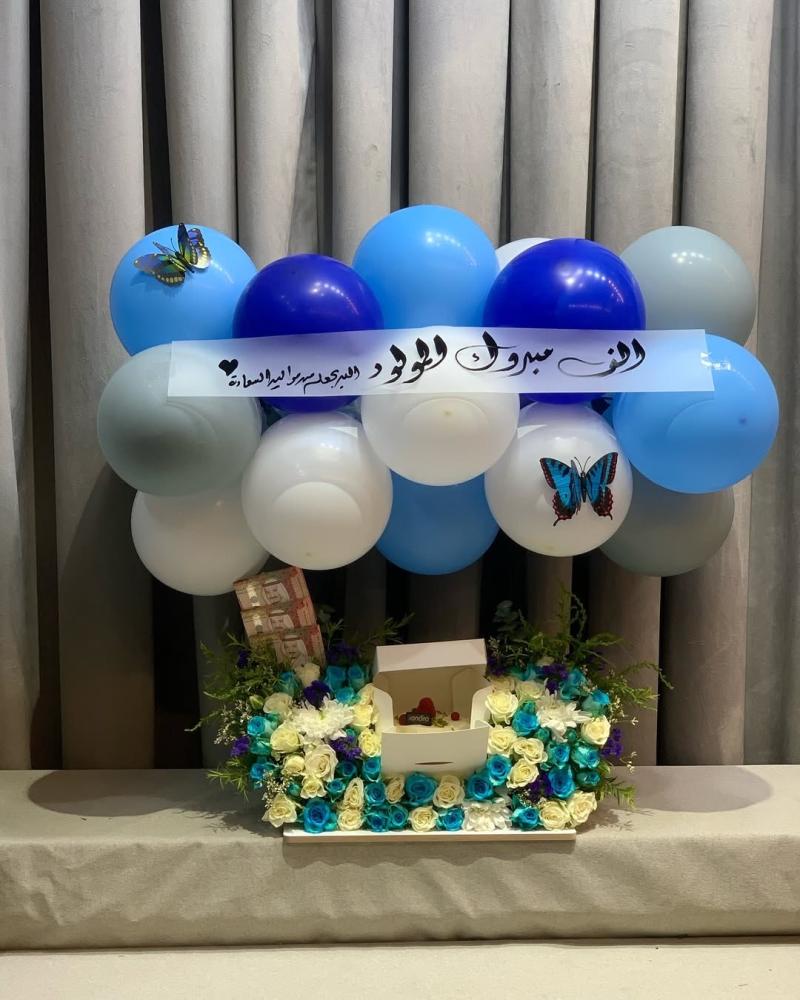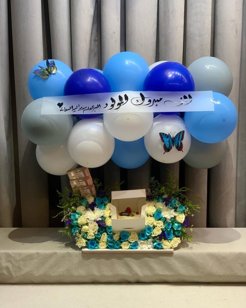 كيكه مع ورد منوع وبالونات شريط مخصص للعباره مع اضافة مبلغ مالي