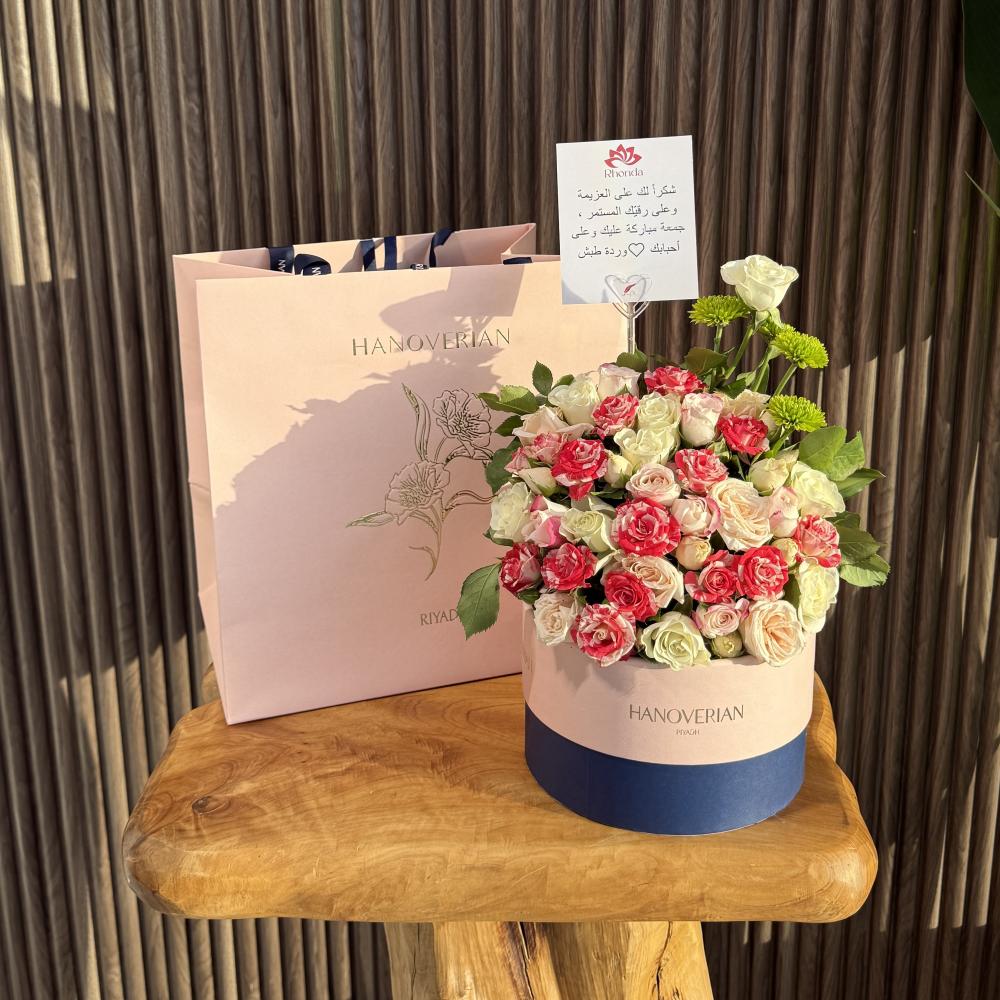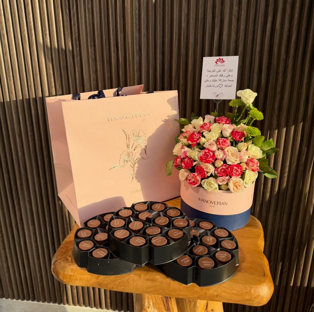 الشكل النهائي : يوضع الورد بمختلف اللوان في اعلى صندوق الشوكولاتة وياتي بتنسيق انيق متعدد مع اضافات جماليه من الاكسسوار الطبيعي