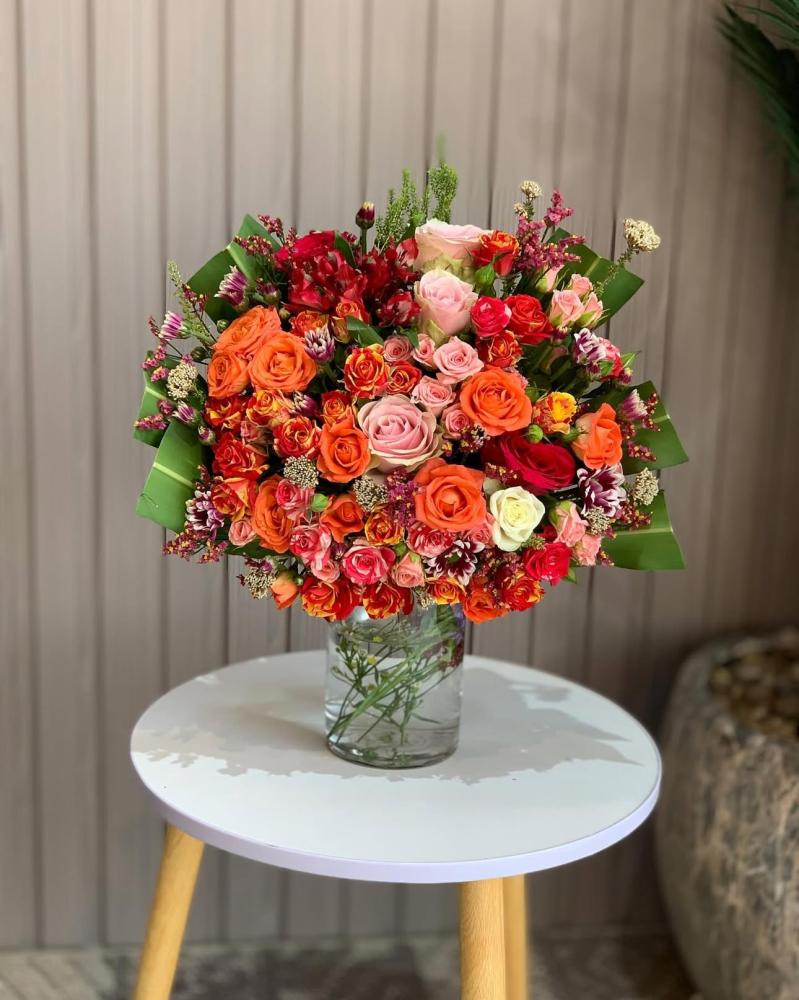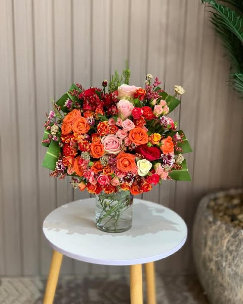 فازة ورد شفافة مع تنسيق ورد بألوان مختلفة