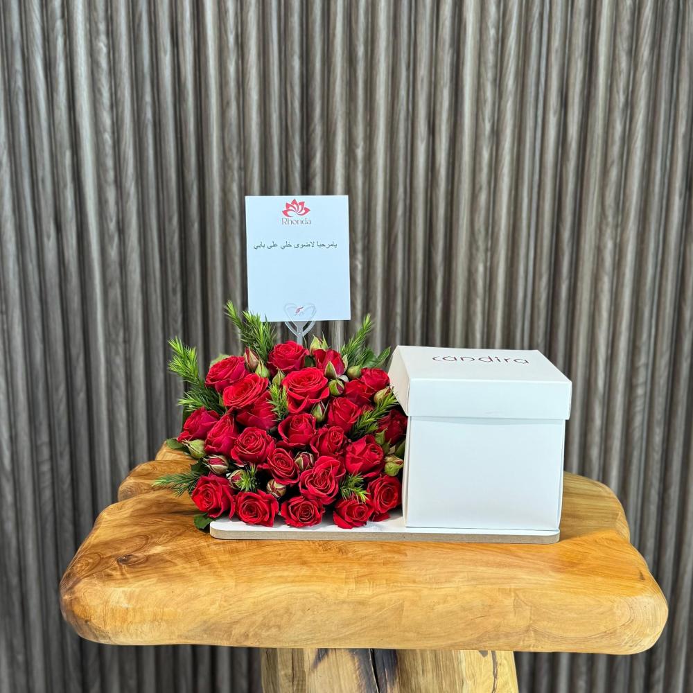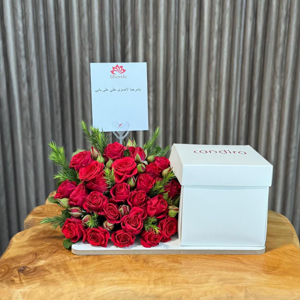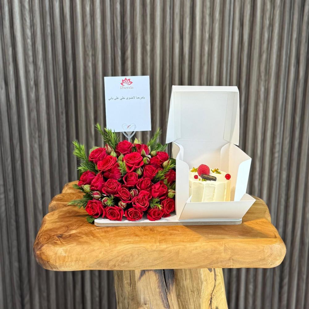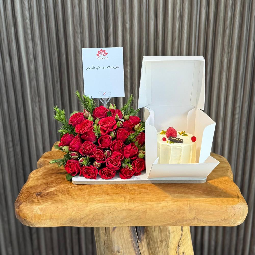 الشكل النهائي : تاتي بتنسيق من الورد الطبيعي بمختلف اللوانه مع قاعده خشبيه توضع فيها الكيكة مع تنسيق الورد ويمكن اضافه عباره على الورد من الورق المطبوع ويمكن اضافه بالون او قبعة تخرج مدفوعة وتاتي بخيارات اكثر وتقدم مع باقة ورد او فازة ورد حسب اختيار العميل